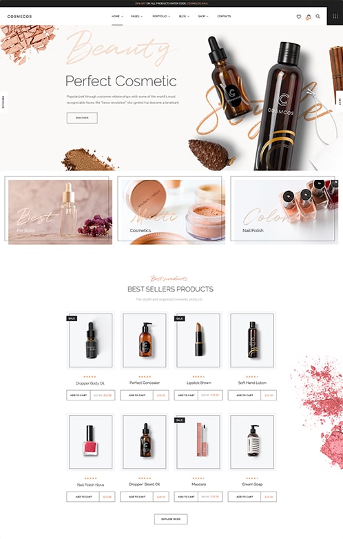 Cosmecos use Elementor Page Builder for work with 100+ elements and blocks. You can create different creative pages.